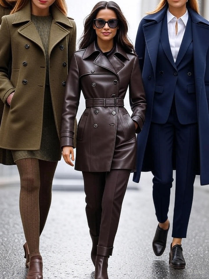 - Leather trench coat with statement belt or contrasting accessories to emphasize quality