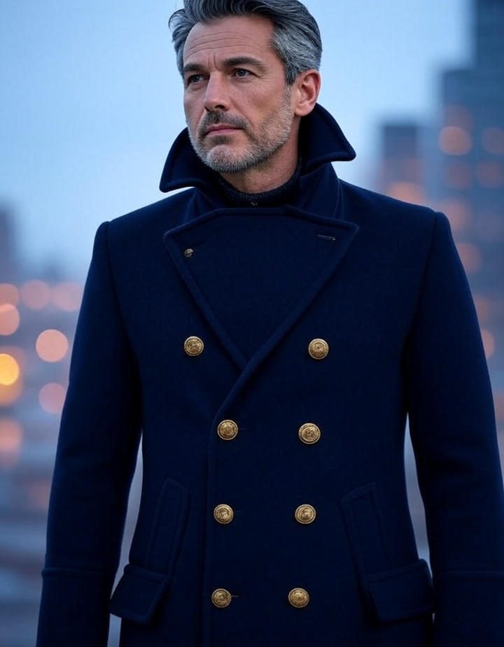 A peacoat is a short or mid-length coat traditionally made of heavy wool. It has a double-breasted front, broad lapels, and often large buttons, with a structured silhouette that enhances torso shape. Originally worn by sailors to protect against cold sea winds, the peacoat today is a staple in both casual and semi-formal wardrobes.