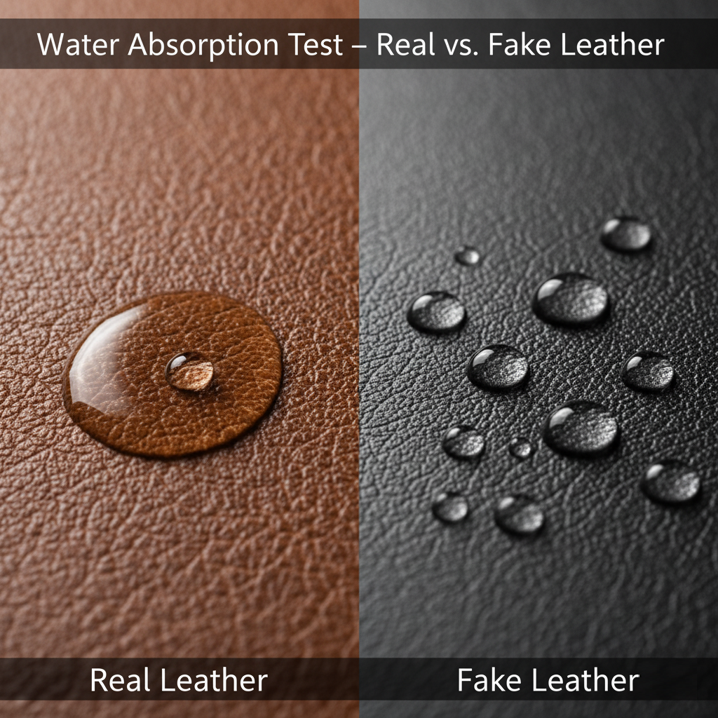 Real leather is porous and absorbs moisture, while fake leather repels liquid.