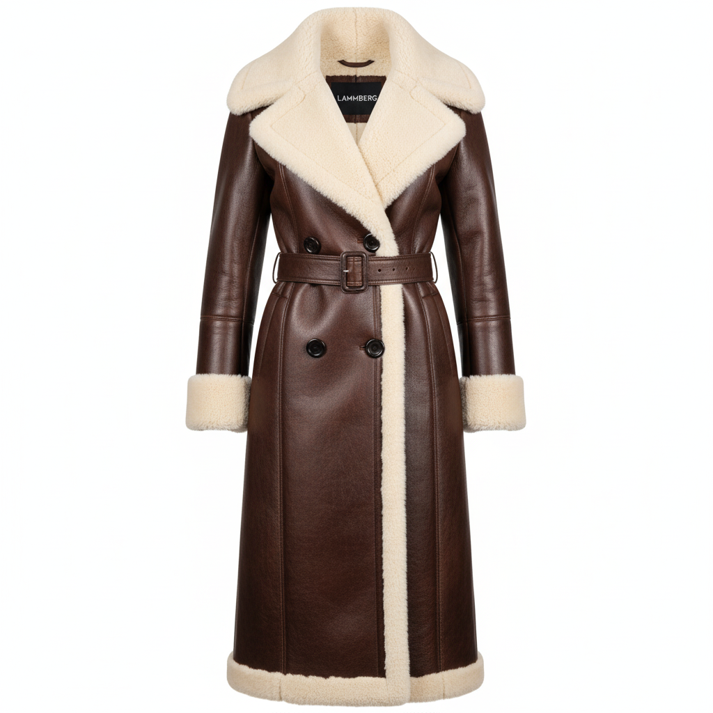 Designed to combat freezing temperatures, this coat is lined with high-quality shearling and made from full-grain leather. Its long silhouette offers full-body warmth while maintaining elegance.